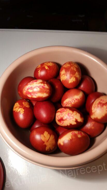 Flomasterima iscrtajte na jajetu cvetiće, srca i druge motive. Preko iscrtanih motiva prelepite lepljivu traku ili stavite listić od neke biljke pa listić pričvrstite starom najlon čarapom. Kuvajte jaja u pripremljenoj lukovini da dobiju boju (postepeno ih zagrevajte i nemojte da ih kuvate na previsokoj temperaturi da ne bi ispucala).