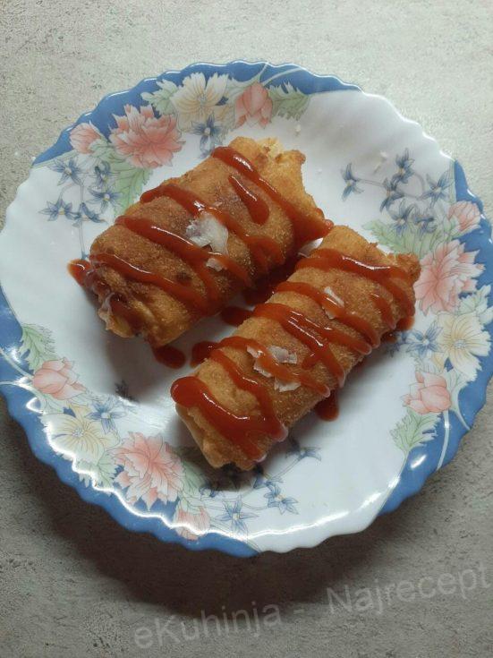 5. Na svaku palačinku stavljati nadev, preklopiti sve 4 strane, urolati i pričvrstiti čačkalicama.