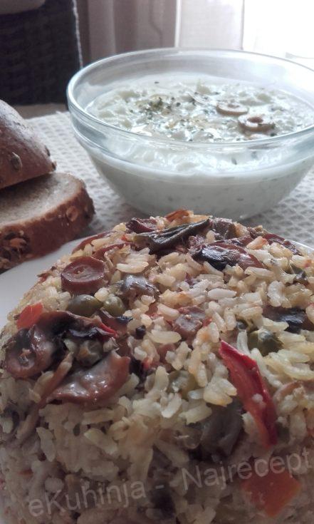 5. Kada je povrće gotovo, skloniti sa ringle, izmešati sa pirinčem, dodati jaja i pavlaku i začine po ukusu (ja sam dodala 3 kašičice vegete, po 2 kašičice suvog vlašca i peršuna i kašičicu origana).