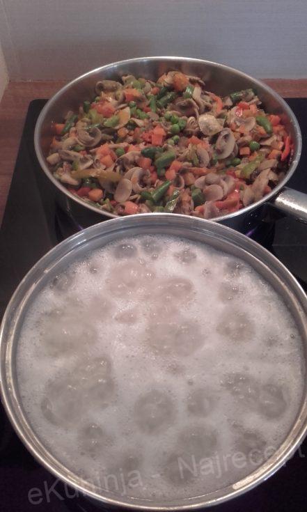 3. Dodati smrznutu mešavinu povrća i dinstati uz povremeno mešanje, dok tečnost ne uvri i povrće se malo zaprži.