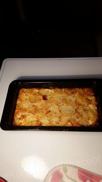 Umutite jaja sa mlekom i malo biljnog začina pa pošto se krompir pekao nekih 15-20minuta prelijte ga pripremljenim prelivom i pecite još 30-45 minuta.
