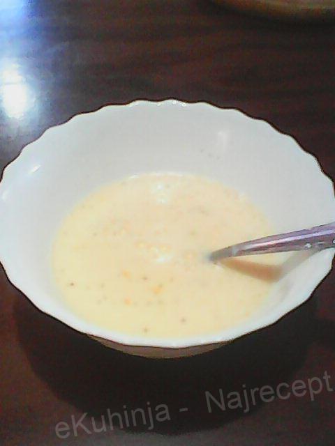 Umutite jaja sa mlekom i malo biljnog začina pa pošto se krompir pekao nekih 15-20minuta prelijte ga pripremljenim prelivom i pecite još 30-45 minuta.