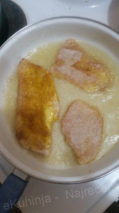 Uvaljati šnicle u brašno i kratko pržiti na malo ulja da porumene sa obe strane.