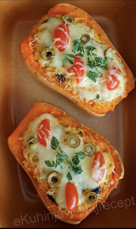 8. Preko tikvi rasporediti kačkavalj, paradajz i masline.