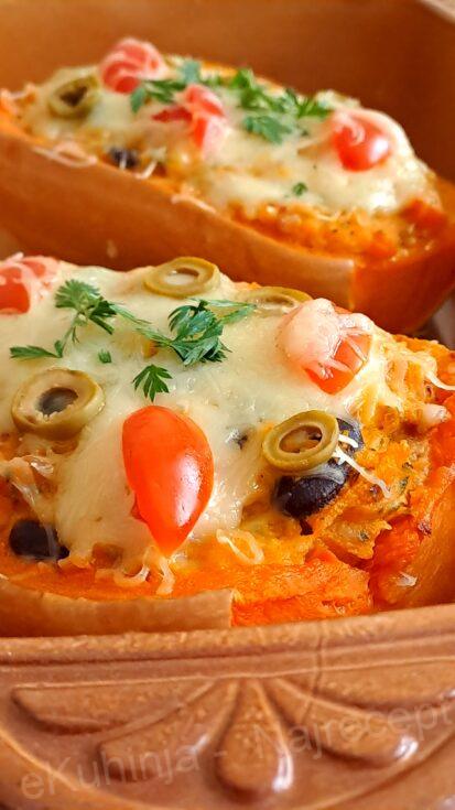 8. Preko tikvi rasporediti kačkavalj, paradajz i masline.