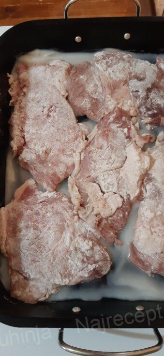 2. Šnicle uvaljajte u brašno i poređajte u pleh. Pomešajte vodu i mleko i u to razmutite mleveni biber i 2 kašičice biljnog začina pa prelijte preko šnicli.