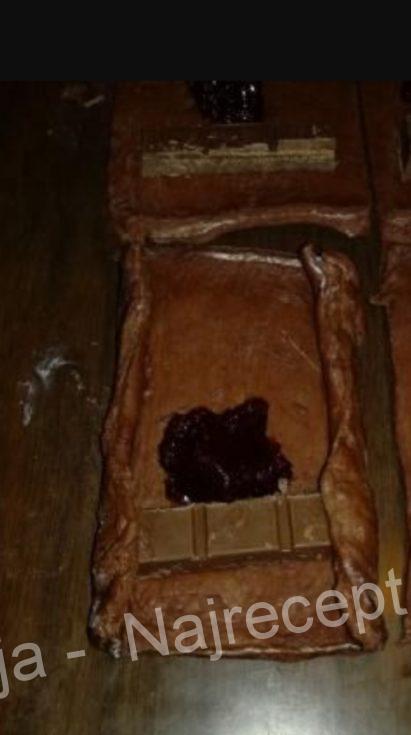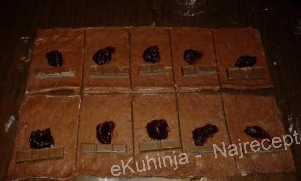 Odstojalo testo razvući i iseći na kvadrate. Filovati sa malo džema od drenjina i staviti malo čokolade.
