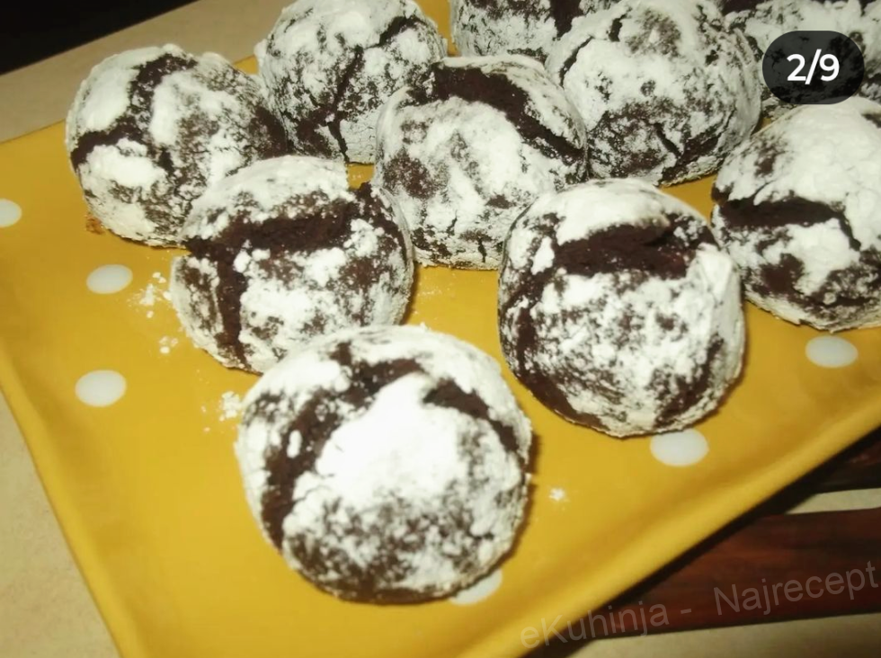Od ove mase vaditi kašičicom i praviti izmedju dlanova loptice veličine oraha. Svaku uvaljati u prah šećer i redjati u pleh obložen papirom za pečenje.