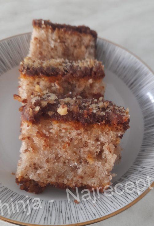 U činiji umutiti jaja sa šećerom. Dodati mleko i ulje pa izmiksati. Dodati brašno sa praškom za pecivo i na kraju lagano umešati orahe. Sipati u podmazan i brašnom posut pleh.