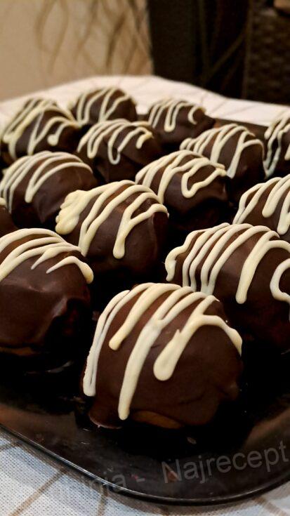 Od smese praviti kuglice, preliti ih istopljenom čokoladom i ukrasiti po želji.