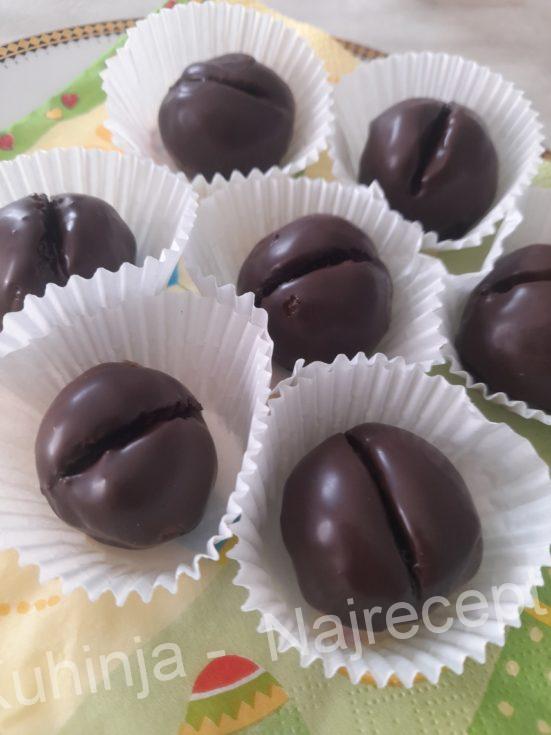 Napraviti glazuru od čokolade, pa svaku kuglicu stavljati na viljušku i prelivati čokoladom, te ređati na tacnu sa pek papirom.
