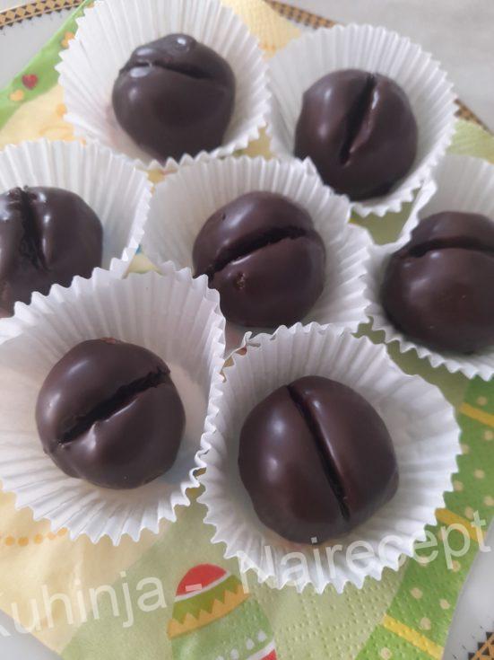 Napraviti glazuru od čokolade, pa svaku kuglicu stavljati na viljušku i prelivati čokoladom, te ređati na tacnu sa pek papirom.