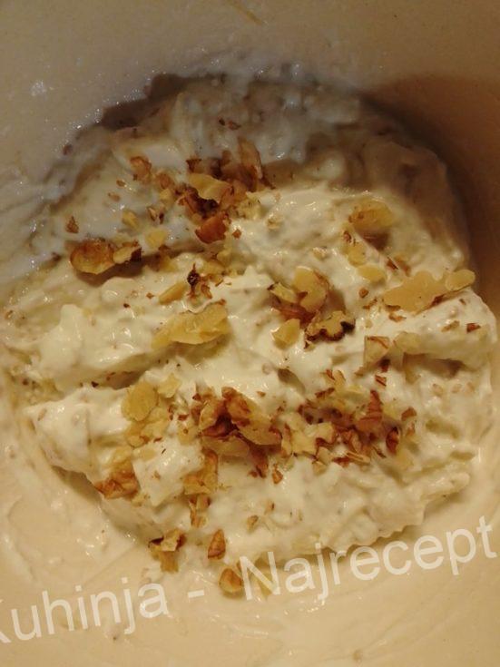 Dodajte 4 kašike prepečenog susama, i umešajte oko 400gr. ovčijeg kiselog mleka.