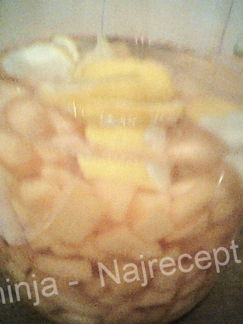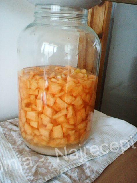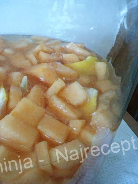 U veću teglu (od bar 3l) stavite iseckanu dinju, kolutove limuna, šećer i nalijte rakijom.