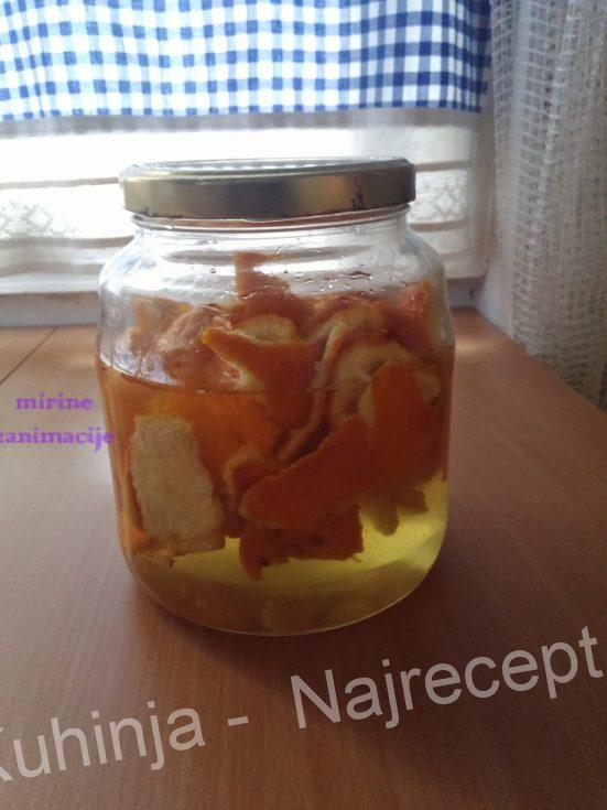1. U rakiju dobro istopite 850 grama secera pa dodajte iseckane 500 grama kore od pomorandze.