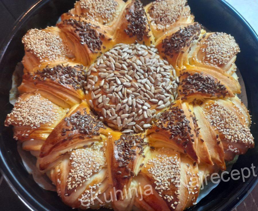 Unutiti žumanca sa mlekom, pa premazati pogaču. Središnji deo posuti semenom suncokreta, prvi red latica susamom, a drugi lanom.