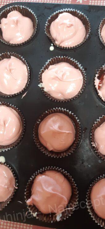 3. Umutite eskimko sladoled od vanile sa 200 ml mleka po uputstvu na kesici. Sipajte u očvrsle čokoladne korpice po 2-3 kašičice sladoleda (ne vadite iz kalupa) pa vratite u zamrzivač na 15 minuta da se sladoled malo stegne.