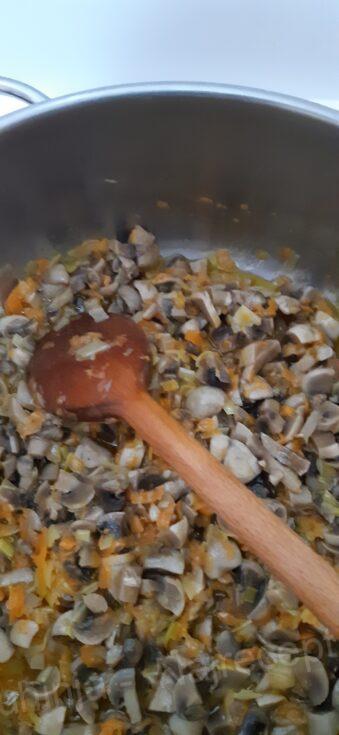 1. Sojine ljuspice prelijte vodom i ostavite da nabubre. Pirinač skuvajte u slanoj vodi, ali tako da se skoro raskuva – treba da bude lepljiv. Praziluk (beli i zeleni deo, ali bez pera) sitno naseckajte i prodinstajte na ulju. Dodajte rendanu šargarepu pa lepo prodinstajte zajedno sa prazilukom.Dodajte i sitno naseckane šampinjone, lepo izmešajte i dinstajte poklopljeno da se pečurke lepo isprže. Posolite, pobiberite i dodajte biljni začin po ukusu.