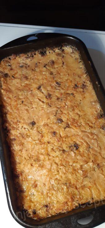 2. U smesu sa pečurkama umešajte sojine ljuspice i obaren pirinač (i jedno i drugo bez suvišne tečnosti), sve dobro izmešajte i rasporedite u nauljenu tepsiju. Brašno i suvi biljni začin razmutite u pivu, tako da nema grumuljica i prelijte preko pripremljene smese.