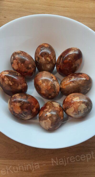 6. Zatim izvaditi iz lonca, ukloniti najlon čarape i lukovinu i dok su jaja još topla premazati ih uljem kako bi imala lepši sjaj.