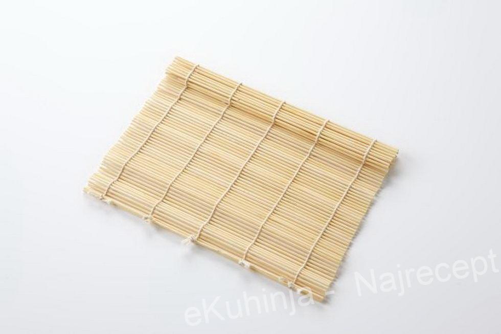 6. Formirajte suši rolnu sa prostirkom, navlažite nori margine, zapečatite rolnu.