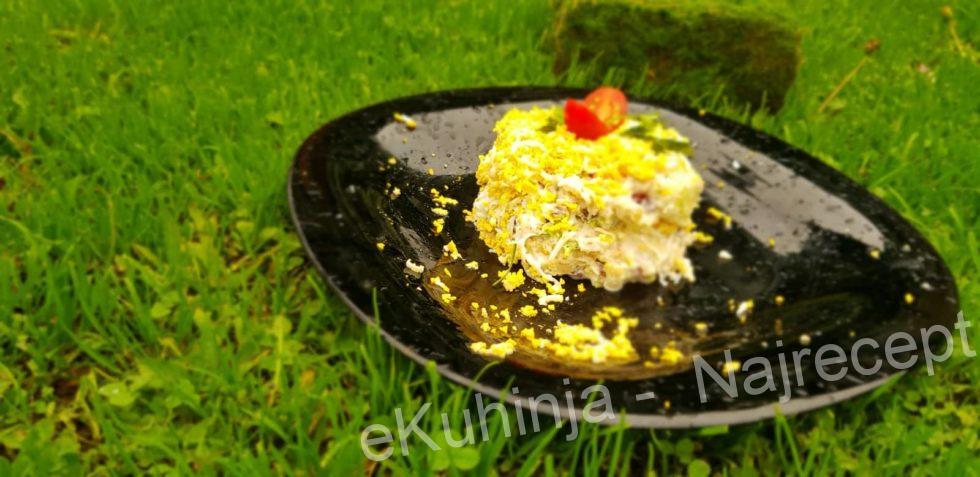 Na tanjir staviti par kašika mešavine sa povrćem, pa rendana jaja i tako redom.