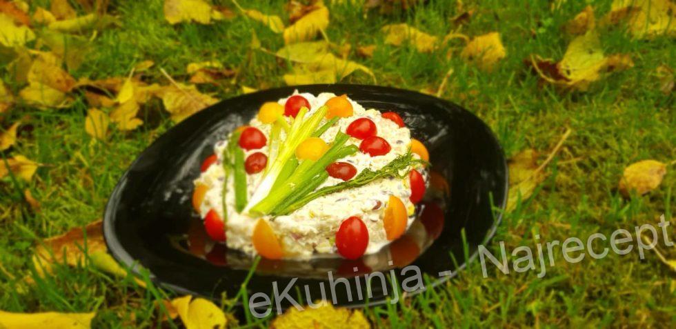 Ohlađenoj Bulgur mešavini dodati 3 seckana krompira i majonez.
