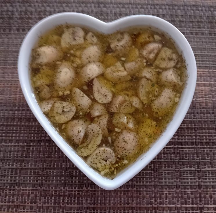 3. U odgovarajuću posudu usuti 3 šoljice hladne vode, dodati suvi začin, so, biber, sirće, ulje i izmešati te preliti šampinjone koje ste ocedili od vode i preručili u dublju posudu.