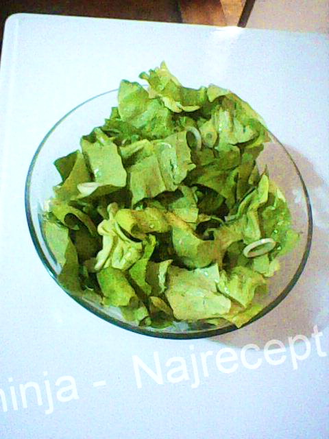 Salatu dobro operite, list po list, pa iskidajte na manje komade u činiju. Dodajte mladi luk seckan na kolutiće, posolite i začinite po ukusu jabukovim sirćetom (može i limunov sok) i maslinovim uljem.
