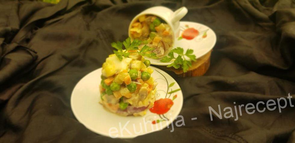 Smesu za rusku salatu skuvati, procediti i ostaviti da se ohladi. Skuvati jaja i iseckati. Šampinjone iseckati i prodinstati na majonezu. Ostaviti da se ohladi. Kada se sve ohladi sve sjedinioti dodati majonez i dobro promešati, služiti po ukusu.