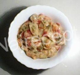 – Pečenu papriku, šampinjone, kisele krastavčiće i barenu šargarepu iseckajte na kockice, kao za rusku salatu. Dodajte malo biljog začina po ukusu.