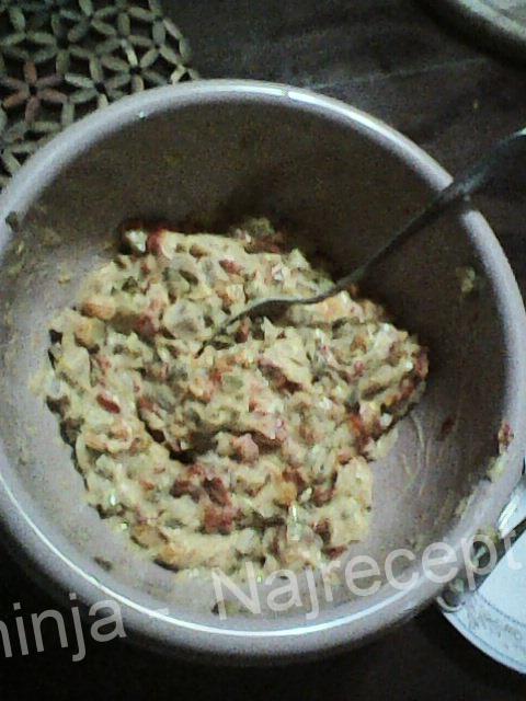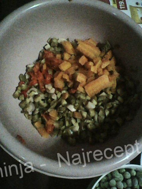 – Pečenu papriku, šampinjone, kisele krastavčiće i barenu šargarepu iseckajte na kockice, kao za rusku salatu. Dodajte malo biljog začina po ukusu.