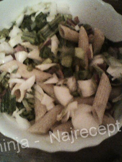 9. Izmešajte luk sa makaronama i graškom.