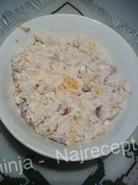 7. Sve lepo izmešajte i ostavite u frižider minimum na pola sata da se ukusi lepo sjedine i salata dobro ohladi.