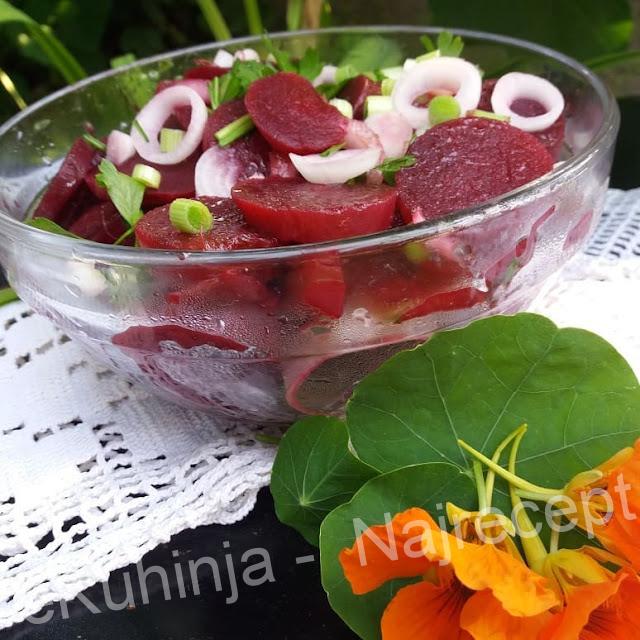 Cveklu oprati i staviti da se kuva da sasvim omekša. Zatim je oljuštiti, iseći na kolutove, posoliti, dodati sitno seckani beli luk, crni luk isečen na kolutove , sirće i po želji, sitno seckan peršunov list. Sve složiti u teglu i staviti u frižider. Pre serviranja dodati ulje.