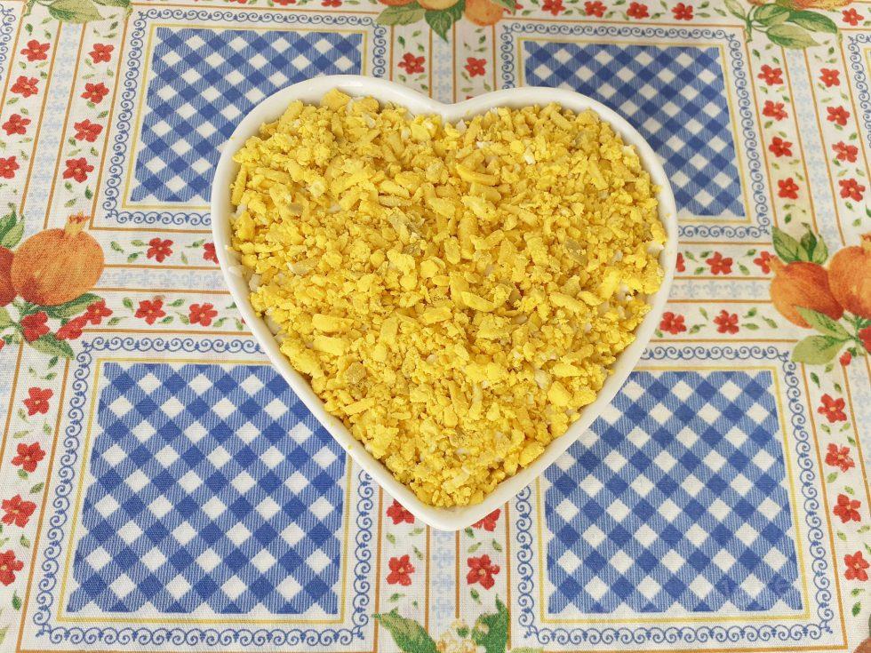 1. Jaja obariti, oljuštiti i odvojiti belanca od žumanaca ,pa posebno narendati belanca, a posebno žumanca.