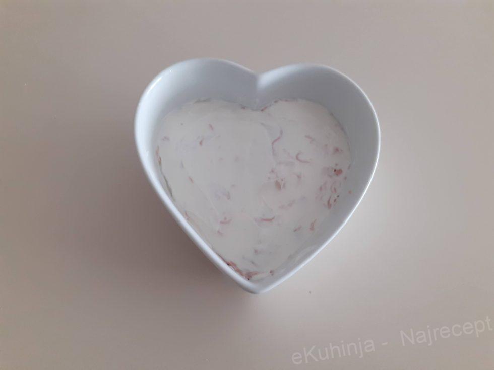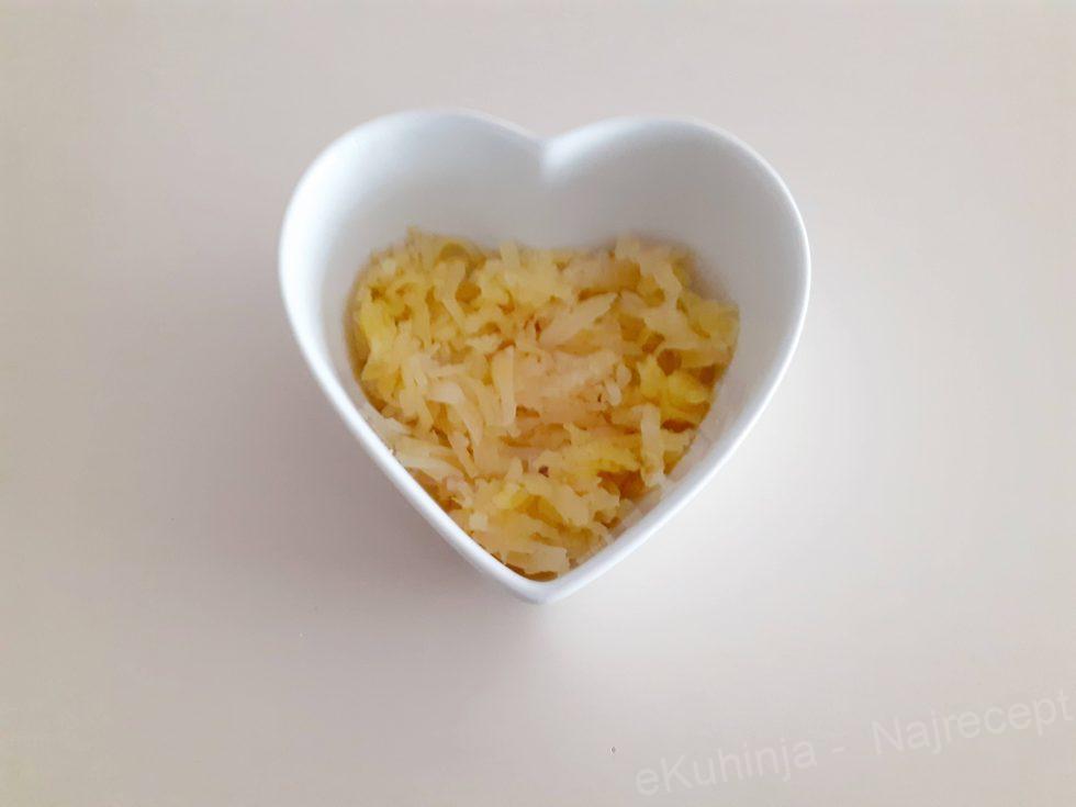 1. Jaja obariti, oljuštiti i odvojiti belanca od žumanaca ,pa posebno narendati belanca, a posebno žumanca.