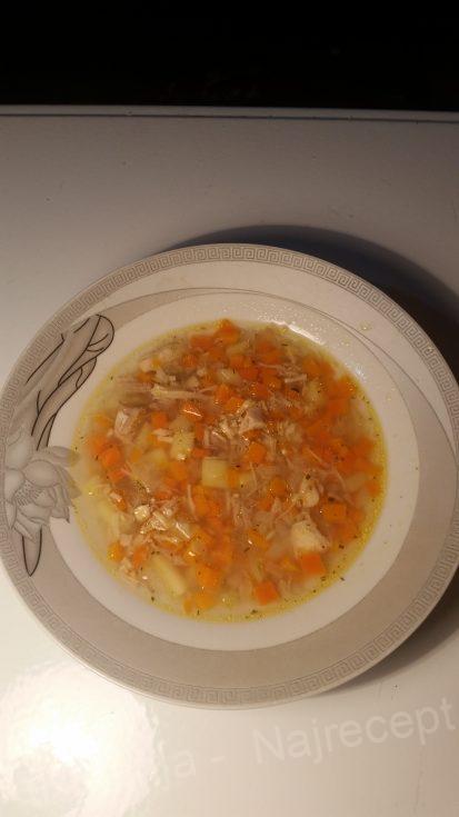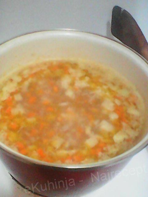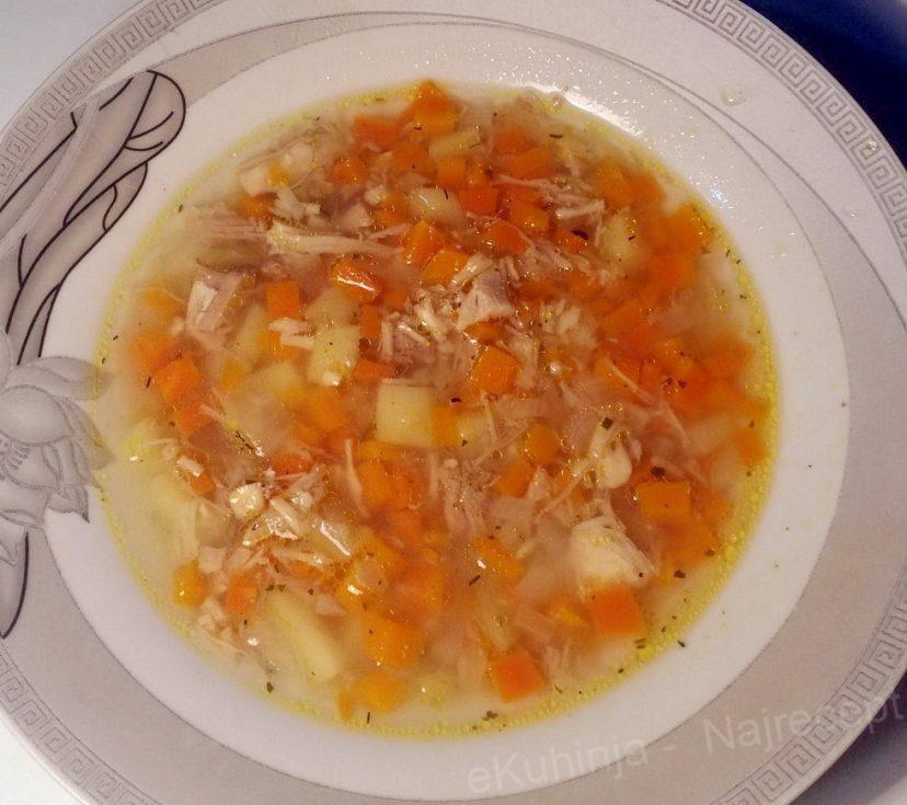 4. Na kraju dodati iseckanu piletinu, posoliti i staviti kašičicu biljnog začina i naliti vodom do želejen gustine.