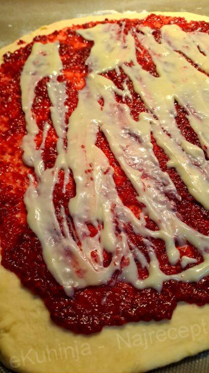 7.  Nadošlo testo rastanjiti u pravougaonu ploču, premazati ga filom od malina, a preko staviti fil od čokolade.