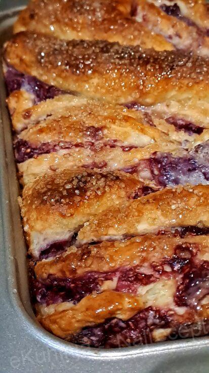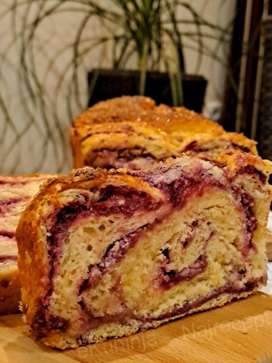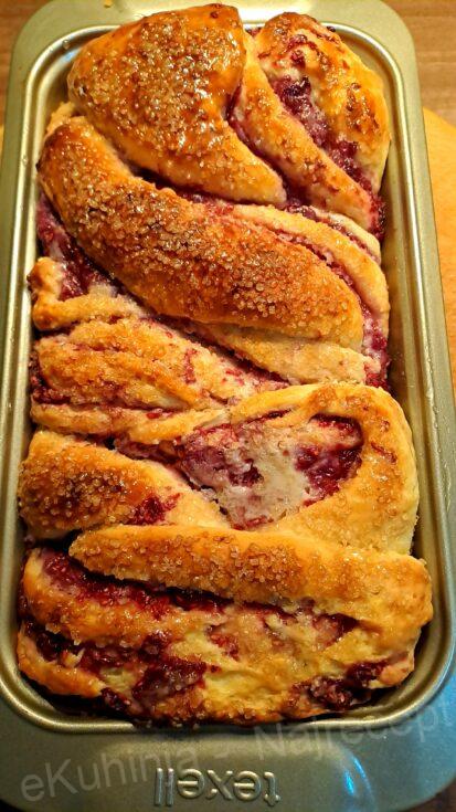 10.  Kada je narasla, pospite je smeđim šećerom i pecite oko 40 minuta na 180 stepeni. Posle prvih dvadeset minuta pokrite aluminijumskom folijom da ne izgori. Proverite štapićem za ražnjić da li je pečena – bitno je da ne ostaje testo, fil je ok.