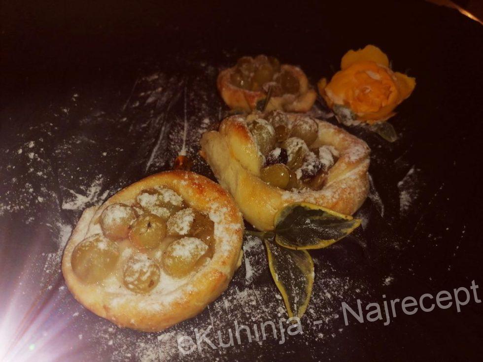 Nadošlo testo izručite na brašnom posutu radnu površinu rastanjite oklagijom i secite na dugačje trake. Trake motajte u krug i formirajte gnezdo Malo udubite i nafilujte rendanij jabukama, to isto uradite i napunite grožđem.