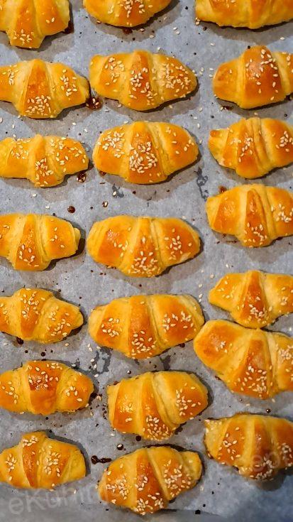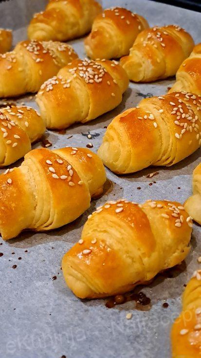 4. Pokriti krpom i ostaviti još pola sata u plehu. Zatim ih premazati umućenim žumancetom i mlekom, posuti susamom i peći 25-30 minuta na 180 stepeni.