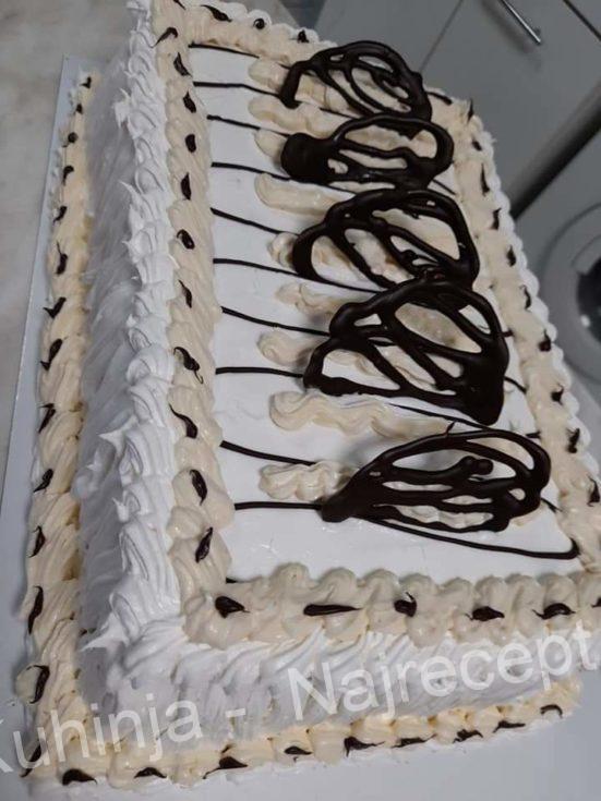 Tortu premazati i ukrasiti šlagom i čokoladom po želji i dobro ohladiti u frižideru.