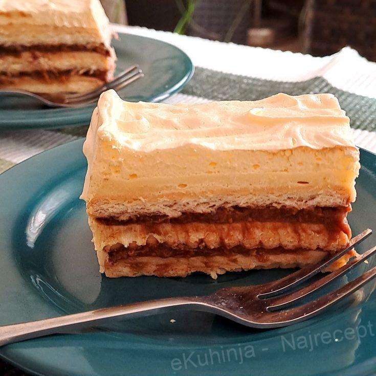8. Naneti novi red keksa, pa postupak ponoviti. Na treći sloj keksa samo naneti preostalu trećinu fila od pudinga, a zatim preko i sa strane umućeni krem šlag od vanile.