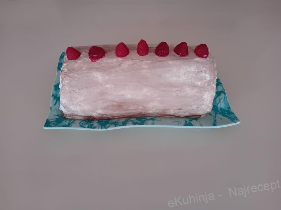 2. Premazati umućenom slatkom pavlakom. Dekorisati po svom izboru (ja sam šarala topingom od čokolade i ponovo premazala sjedinjujući slatku pavlaku i toling, a odgore sam poređala maline) .Ostaviti u zamrzivač na par sati.