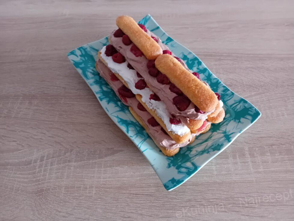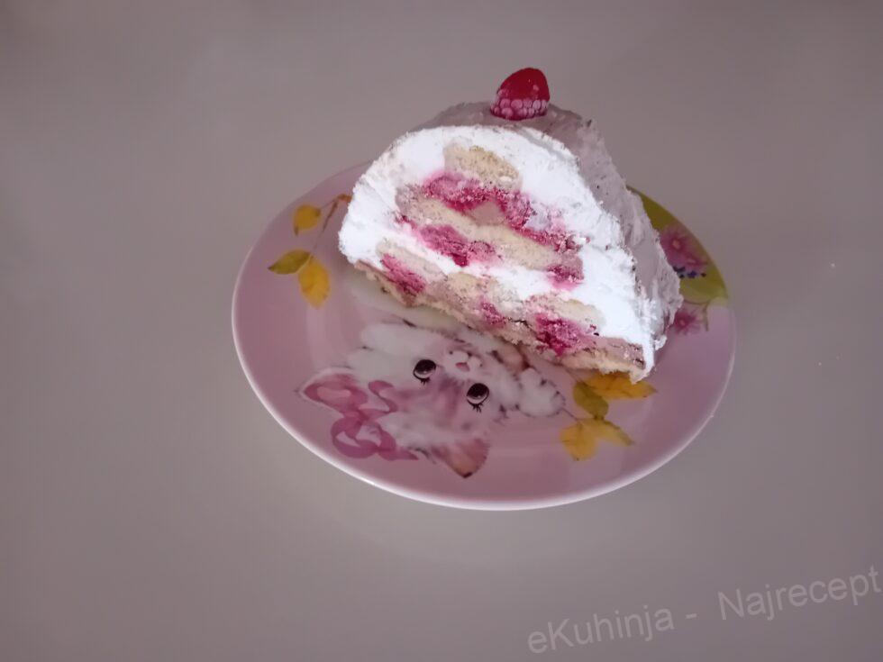 1. Mikserom umutiti slatku pavlaku u čvrst šlag. Šlag krem umutiti po uputstvu sa kesice. Mleko usuti u dublju posudu, dodati vanilin šećer i izmešati. Piškote umakati u mleko i slagati na tacnu 4×2 komada. Preko naneti umućeni šlag krem ,a zatim rasporediti maline. Piškote umakati u mleko i poređati preko malina 3×2 komada, pa premazati umućenom slatkom pavlakom, a zatim rasporediti maline. Zatim piškote umakati u mleko i poređati preko malina 2×2 komada, pa šlag krem i na kraju maline. Zadnji red su piškote kvašene u mleko 1×2 komada.