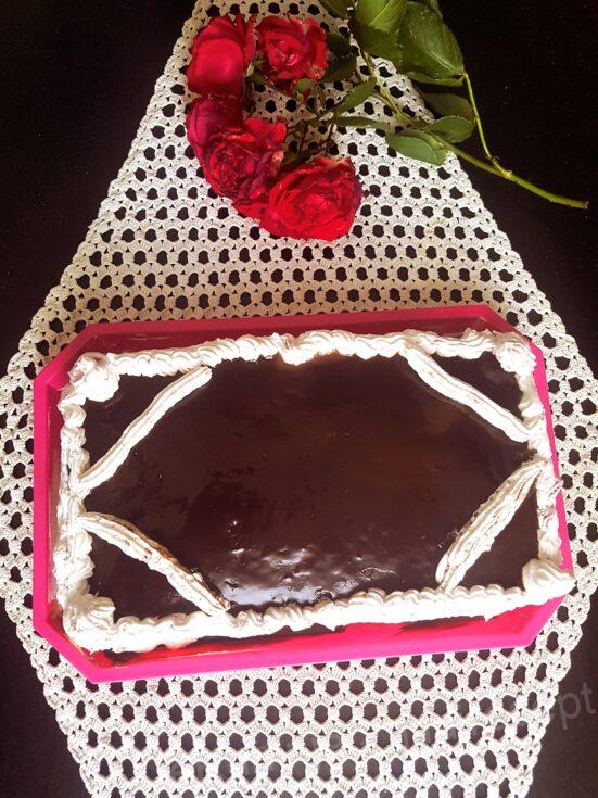 6. U manji sud stavite ćokoladu izlomljenu na kocke, šećer, vodu ili mleko i sve zagrevajte na laganoj vatri dok se čokolada ne otopi. Na kraju dodajte ulje i prelijte tortu odozgo.