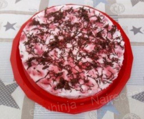 6. Tortu izvaditi iz frižidera i ukloniti obruč, pa posuti rendanom čokoladom.