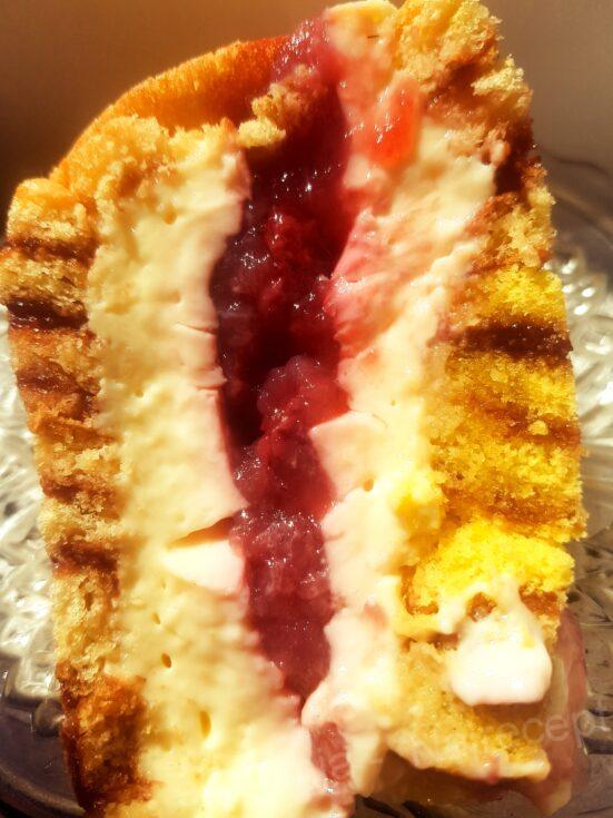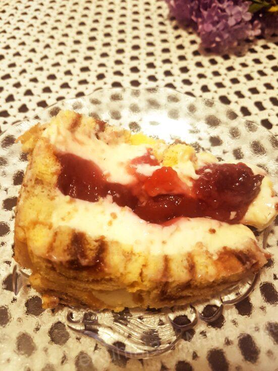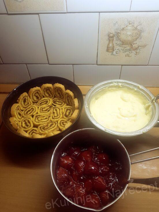 5. Rolat isecite na tanke komade pa ih poređajte po dnu i uz unutrašnje ivice oble činije (treba da ostane rolata i za vrh). Sipajte polovinu krema pa fil od jagoda i preko njega ostatak krema.