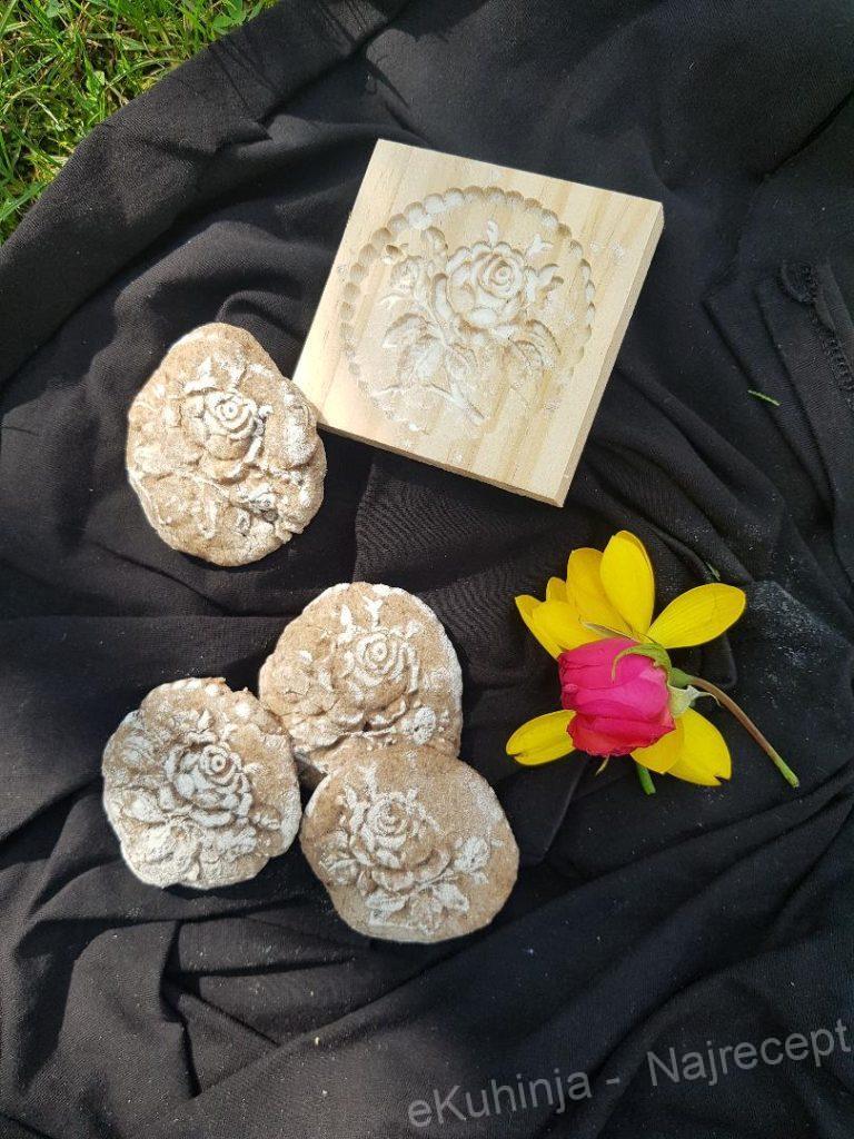- Jufku rastanjiti oklagijom u četvrtasti oblik, na debljinu oko 2 mm. Uzeti nož i testo seći na širinu oko dva centimetara. Testo motati u spiralu. Ovaj put pobrašnjaviti kalup staviti kuglu testa u kalup razvući oklagijom i istresti iz kalupa. Izvice ako su neravne iseći nožem.